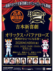 吉本新喜劇×オリックス・バファローズ〜関西がひとつになる夜〜 日程:2026年1/16(金) 場所:COOL JAPAN PARK OSAKA WWホール 時間:開場18:45 開演19:15 終演21:15予定 料金:前売6,000円/当日6,500円 ※全席指定 出演:間寛平、酒井藍、島田珠代、咲方響 ほか吉本新喜劇座員 麦谷祐介(2024年ドラフト1位) 寺西成騎(2024年ドラフト2位) オリックス・バファローズ球団マスコット バファローブル バファローベル